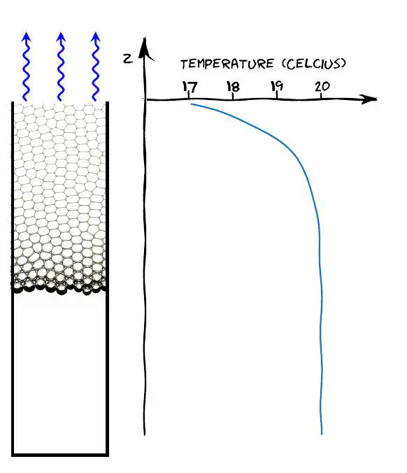 Various parameters affect the foam stability: surface and bulk rheology of the solution, gravitational drainage, mechanical vibrations, bubble gas composition, and also evaporation. Evaporation is often considered through the prism of a liquid loss, but it also induces a cooling effect due to the enthalpy of vaporization. In this study, we combine a theoretical and experimental approach to explore the temperature field in a foam column evaporating from the top. We show that a measurable temperature profile exists in this geometry with temperatures at the interface lower than the environmental temperature by few degrees. We demonstrate that the temperature profile is the result of a balance between the enthalpy of vaporization and heat fluxes originating from the thermal conduction of foam and air and the thermal radiation. For small foam thicknesses compared to the radius, we found that the temperature gradient is established over the foam thickness while for large aspect ratios, the gradient is spanning over a lengthscale comparable to the tube radius.